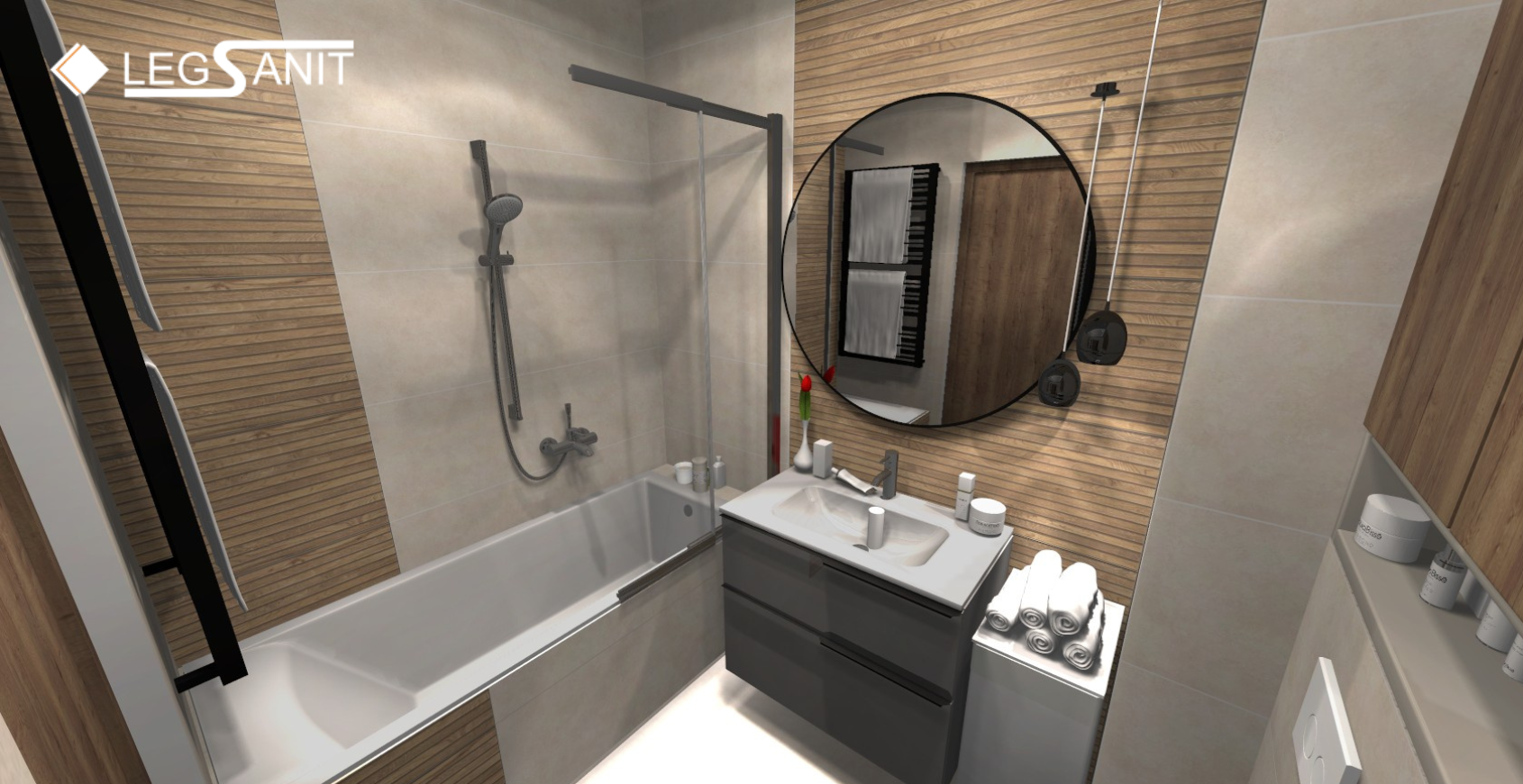 Nad wanną zamontowano praktyczny parawan Deante Prizma 100×140 cm w kolorze titanium, który umożliwia szybki prysznic bez rozchlapywania wody, a dzięki powłoce hydrofobowej Active Cover utrzymanie szkła w czystości jest niezwykle łatwe. Model jest składany i odwracalny, można go przesunąć na lewą lub prawą stronę w zakresie 180°, a hartowane szkło zapewnia bezpieczeństwo użytkowania.